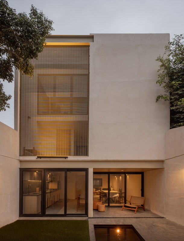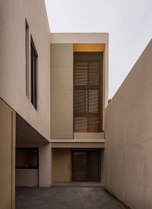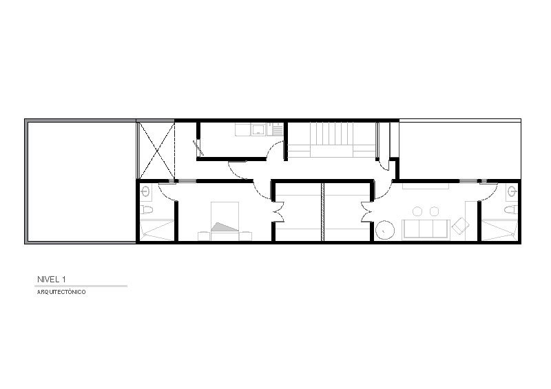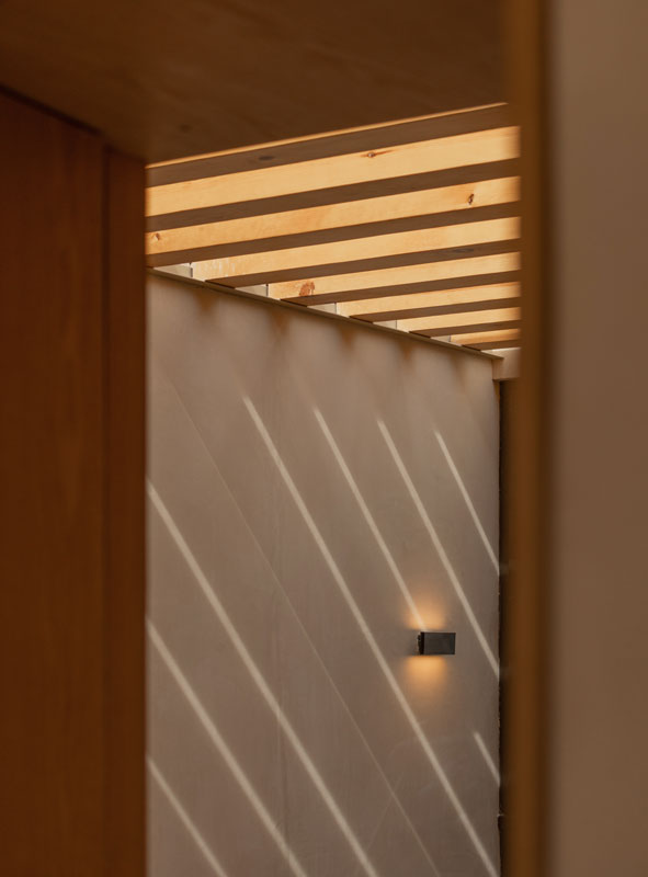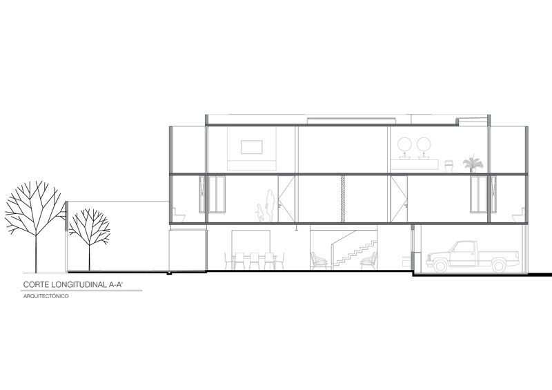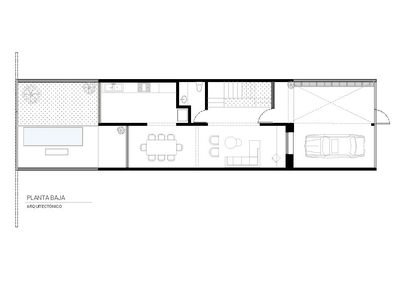 La intervención se estructura a partir de un eje longitudinal, que corta la propiedad en dos, generando una trama espacial dinámica y desplazada respecto a la geometría original. Este desfase provoca una sucesión de planos que se superpone, creando una secuencia de espacios que se van alternando en sentido transversal; que ofrece zonas de transición, luz controlada y relaciones inesperadas.
